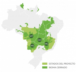El Cerrado es el segundo bioma más grande de América del Sur, está compuesto por sabanas y pastos en medio de humedales y bosques tropicales, situados en las tierras altas del Brasil central. Corresponde al 22% del territorio brasileño, cubriendo más de 2 millones de km². De su superficie total, el 30% está ocupada por pastos y el 12% por cultivos agrícolas, principalmente de soja. El Cerrado abarca los estados de Goiás, Tocantins, Mato Grosso, Mato Grosso do Sul, Minas Gerais, Bahia, Maranhão, Piauí, Rondônia, Paraná, São Paulo y el Distrito Federal.