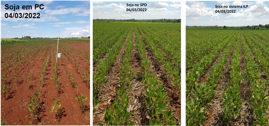 As imagens capturadas durante a forte estiagem que afetou a safra de 2021/2022 revelam claramente como os diferentes sistemas de manejo influenciaram a cultura da soja. Os resultados são evidentes: o Sistema Plantio Direto e a Integração Lavoura-Pecuária demonstraram ser mais resilientes em comparação com o sistema convencional: